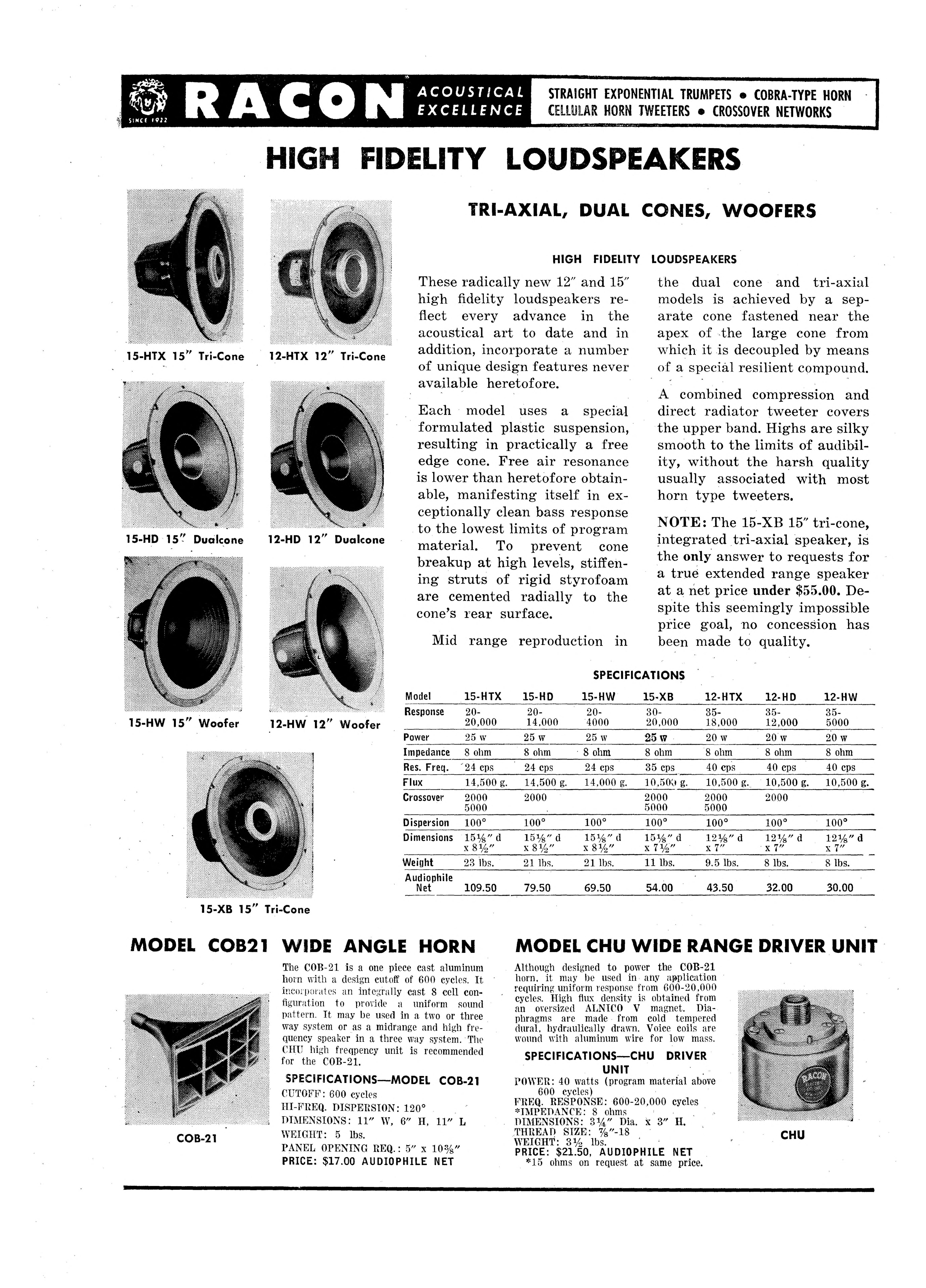 - #17081 [Pilotrol], 26-02-12 08:36Racon是一家美國老牌揚聲器公司,他們早在20年代已經在市場上挑戰Western Electric在PA和劇院用號角揚聲器上的市場地位! 不過Racon在紙盤揚聲器發展上卻較遲,以下是Racon於50年代中的Hi-Fi揚聲器單元的產品線!