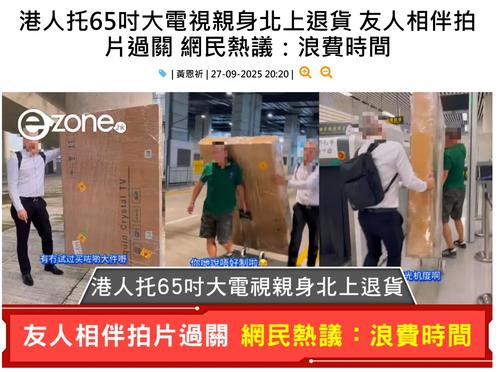 網上來源:https://ezone.hk/article/20068498/港人托-吋大電視親身北上退貨-友人相伴拍片過關-網民熱議-浪費時間